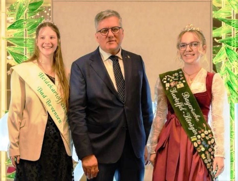 Paula I, Heidekartoffelkönigin, DKHV-Präsident Thomas Herkenrath und Elena I, Bayerische Kartoffelkönigin. (Foto © DKHV)