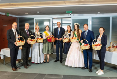 Jedes Jahr im Herbst regiert der deutsche Apfel das Bundeskanzleramt. Das Apfelkabinett ist mittlerweile eine Tradition, die zur Jahreszeit gehört, wie bunte Blätter und die Zeitumstellung. Bundeskanzler Friedrich Merz empfing die Apfel- und Blütenköniginnen aus den bedeutendsten deutschen Obstregionen zum alljährlichen "Apfelkabinett".