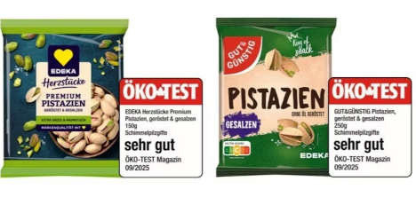 Mit erfreulichem Ergebnis: Die EDEKA Produkte EDEKA Herzstücke Premium Pistazien geröstet & gesalzen sowie GUT&GÜNSTIG Pistazien gesalzen, ohne Öl geröstet schnitten mit der Bestnote „sehr gut“ ab.