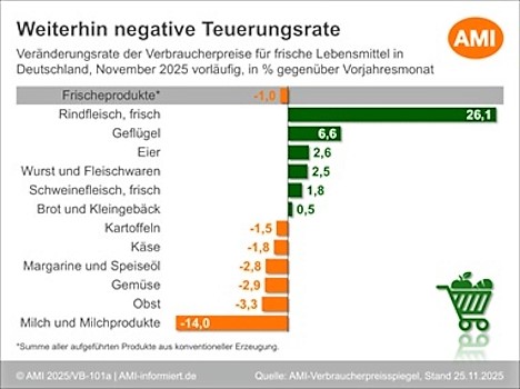 Dem AMI-Frischeindex zufolge zahlen die Verbraucher für frische Lebensmittel in den ersten drei Novemberwochen 1,0 % weniger als ein Jahr zuvor. In der Summe liegt die Teuerungsrate damit den zweiten Monat in Folge im negativen.