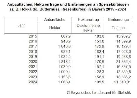 Die bayerische Kürbisernte liegt im Jahr 2024 bei rund 21 310 Tonnen. Im Vergleich zum Vorjahr mit rund 18 336 Tonnen steigt die Produktion um 16,2 Prozent. Hokkaido-, Butternut-, Riesen- und andere Speisekürbisse werden von 351 Betrieben auf einer Freilandfläche von rund 1 068 Hektar angebaut.