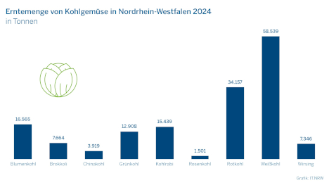 Kohlgemüse wurde im Jahr 2024 auf 4.022,9 Hektar Freifläche angebaut; es wurden insgesamt 158.036 Tonnen auf den nordrhein-westfälischen Feldern geerntet.