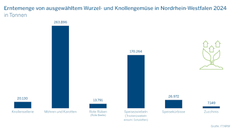 Im Jahr 2024 wurden in Nordrhein-Westfalen rund 880.562 Tonnen Gemüse auf einer Freifläche von 28.227,2 Hektar geerntet. Wie Information und Technik Nordrhein-Westfalen als Statistisches Landesamt anlässlich des Erntedankfestes am 5. Oktober 2025 mitteilt, war Spargel (4.340,6 Hektar) die anbaustärkste Gemüseart.