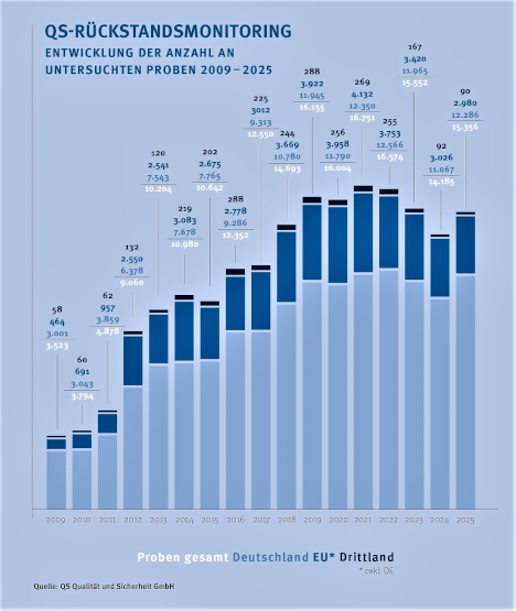 Entwicklung der Probenanzahl: Zwischen 2009 und 2025 stieg die Anzahl der für das QS-Rückstandsmonitoring untersuchten Proben deutlich: Von 3.523 in 2009 auf 15.356 Proben in 2025. (Infografik © QS Qualität und Sicherheit GmbH / www.q-s.de)