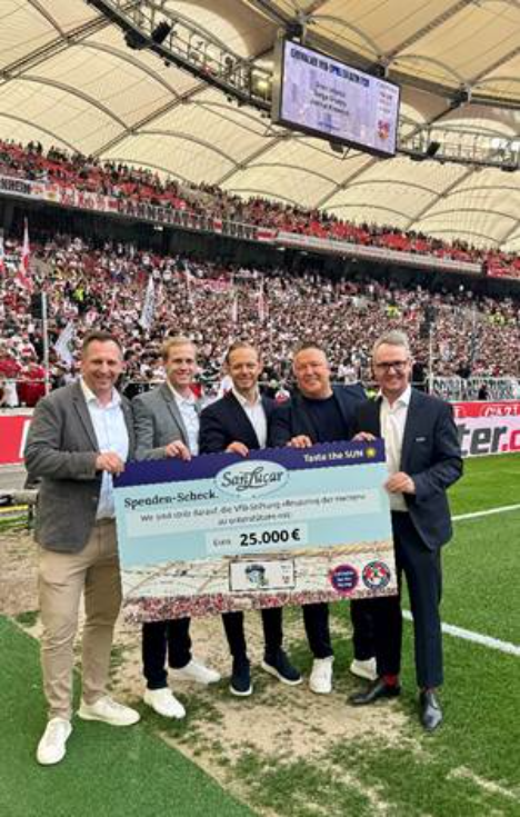 Der Spendenscheck wurde beim Topspiel der Bundesliga am 04.05.2024 gegen den FC Bayern München an die VfB-Vorstände Alexander Wehrle und Rouven Kasper sowie den Geschäftsführer der VfB-Stiftung Steffen Lindenmaier, von SanLucar CEO und seinem Deutschland Team übergeben.