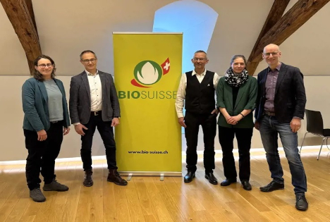 Laura Spring, Rolf Bernhard, Urs Brändli, Dora Fuhrer und Balz Strasser von Bio Suisse. (Foto © LID / rho)