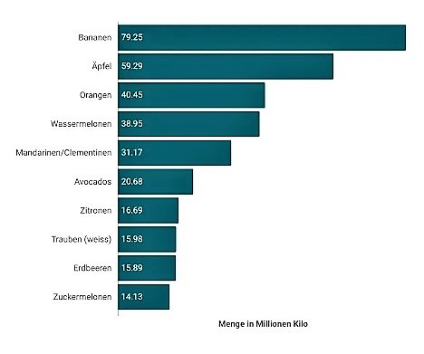 Auf den nächsten Rängen kommen Äpfel und Orangen, gefolgt von Wassermelonen, Mandarinen/Clementinen sowie Avocados. Insgesamt gingen 460 Millionen Kilo Früchte über den Ladentisch.