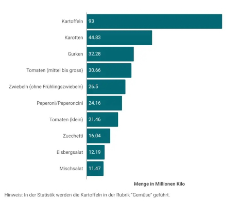 Insgesamt wurden in diesem Bereich 463 Millionen Kilo über den Detailhandel verkauft, davon 93 Millionen Kilo Kartoffeln, 3% mehr als im Jahr zuvor. Meistverkauftes Gemüse waren die Karotten mit 44,83 Millionen Kilo, gefolgt von Gurken und mittleren und grossen Tomaten. Würde man auch die kleinen Tomaten hinzuzählen, nähmen die Tomaten allerdings den Spitzenplatz ein.