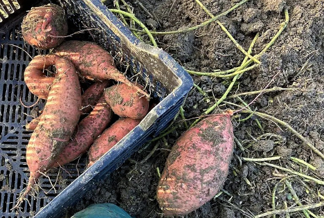 Nach ungefähr 24 Wochen sind die Süsskartoffeln Ende Oktober bereit zur Ernte. Wie das Pflanzen und Jäten bedeutet auch die Ernte viel Handarbeit: Mit einem Schüttelgraber werden die Süsskartoffeln an die Oberfläche gebracht und danach von Hand eingesammelt.