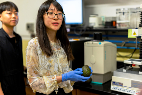 Luyao Ma, verwendet ein Texturanalysegerät, um die Festigkeit einer Avocado zu messen. (Foto © Oregon State University / Brian Horne)