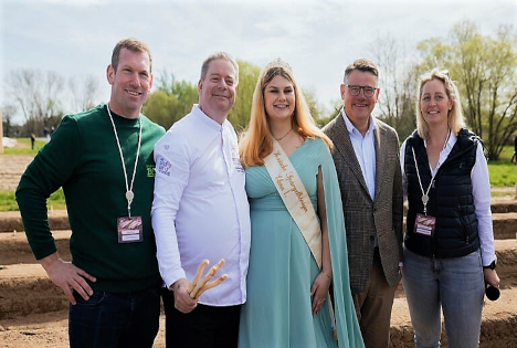 Ministerpräsident Boris Rhein hat gemeinsam mit der neuen Hessischen Spargelkönigin Elena I. und Profikoch Stefan Pappert die Spargelsaison bei Bauerladen Benz in Darmstadt-Arheiligen eröffnet. (Foto © MGH / Jonas Reuter)