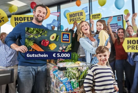 Dies gehört gefeiert, darum dürfen Kund:innen mitfeiern und gewinnen: Beim großen Gewinnspiel gibt es unter anderem einen Jahreseinkauf bei HOFER im Wert von 5.000 Euro zu ergattern.