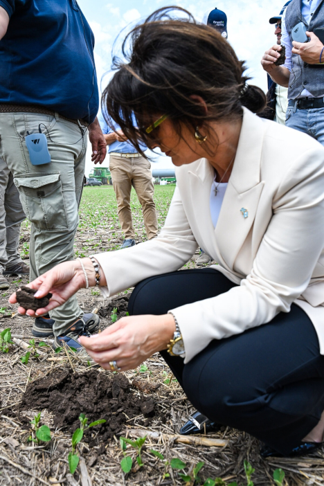 Landwirtschaftsministerin Michaela Kaniber mit einer Bodenprobe: Fruchtbarste Böden, die aber von Erosion, zum Beispiel durch starke Winde, bedroht sind, werden hier durch Schlitzsaat in eine Mulchschicht besser geschützt. (Foto © Judith Schmidhuber / StMELF)