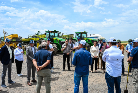 Die Delegation lässt sich beim Betrieb Agrícola Testa in Pergamino in der Provinz Buenos Aires die dortigen Verfahren erläutern. Die Betriebsleiter schildern, wie sie Landwirtschaft und Naturschutz mithilfe modernster Digitalisierungsmethoden in Einklang bringen wollen. (Foto © Judith Schmidhuber / StMELF)