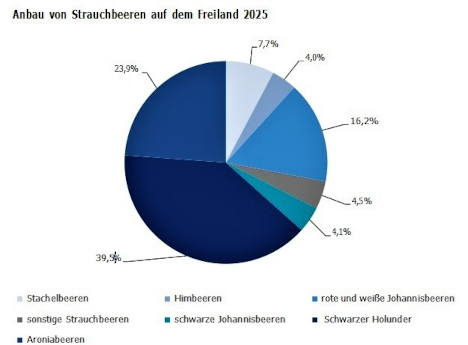 Die übrigen Strauchbeeren (schwarze, rote und weiße Johannisbeeren, Himbeeren, Stachelbeeren, Brombeeren und Kulturheidelbeeren) verteilten sich auf 14 Hektar Anbaufläche.