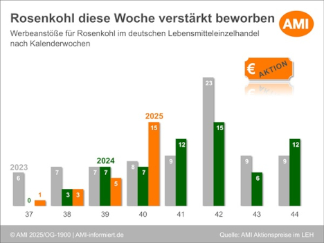Aktuell wird Rosenkohl aus Deutschland, den Niederlanden und Belgien beworben. Die Aktionspreise für konventionelle Ware liegen zwischen 1,00 und 2,22 EUR/kg.
