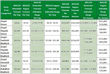 Die prognostizierten Gewinne pro Tray für Zespri-Green-, Organic-Green- und Organic-SunGold-Kiwis liegen nun über dem oberen Ende der August-Prognose. Auf der Ebene pro Hektar werden nun Rekordeinnahmen für alle Fruchtgruppen erwartet.