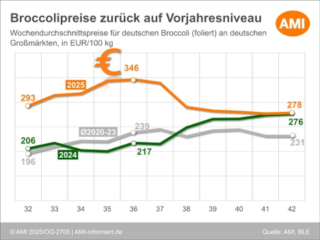 Zum Saisonende gingen die Abgabepreise für deutschen Broccoli deutlich zurück. Zwar liegen sie mit durchschnittlich 2,78 EUR/kg (deutsch, foliert) in der aktuellen 42. Woche an den deutschen Großmärkten noch um 16 % über dem Mittel der 5 Vorjahreswochen, doch nach einer hochpreisigen zweiten Saisonhälfte erreichen sie nur noch Vorjahresniveau.