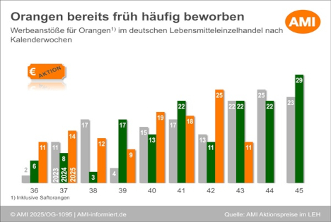 In der aktuellen 43. Woche fällt die Zahl der Werbeanstöße für Orangen wieder deutlich niedriger aus als in der Vorwoche. Nur 11-mal sind Orangen in den Werbezetteln des LEH vertreten.