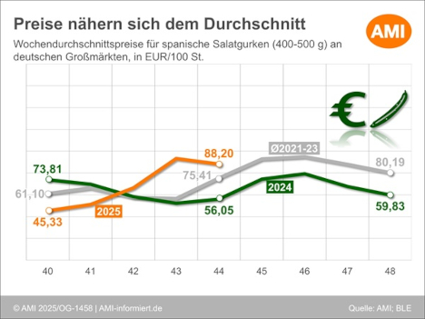 So liegen die Preise für spanische Salatgurken (Sortierung 400 - 500 g) in der laufenden 44. Woche mit durchschnittlich 0,88 EUR/St. an den deutschen Großmärkten zwar 5 % unter dem Vorwochenwert, aber noch 22 % über dem Schnitt der Jahre 2021 bis 2023.