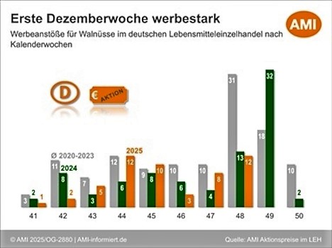 Im Herbst 2025 hat der deutsche Lebensmitteleinzelhandel deutlich weniger Walnüsse beworben als in anderen Jahren. Hauptgrund ist der spätere Start der Angebotssaison. Erst in der 41. Woche 2025 wurden erste Werbungen geschaltet und damit 4 Wochen später als sonst üblich.