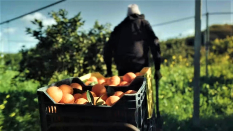 Eine Obstplantage im Süden Italiens. Ein junger Mann in langen Hosen, einer braunen Jacke und einer weissen Mütze pflückt Orangen von den Bäumen, legt die Früchte in schwarze Kisten und stapelt diese auf einen Wagen.
