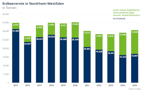 Im Jahr 2025 haben Erdbeerbetriebe in Nordrhein-Westfalen rund 30.700 Tonnen Erdbeeren geerntet. Wie Information und Technik Nordrhein-Westfalen als statistisches Landesamt anhand endgültiger Ergebnisse der Gemüseerhebung mitteilt, waren das 5,1 % mehr als im Vorjahr.